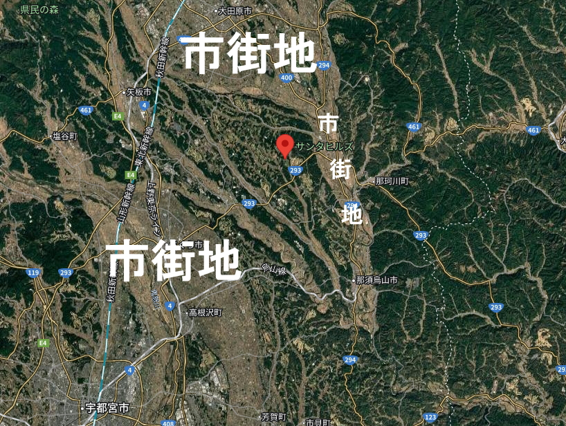 地図を見る限り、北西方面と南東方面に進入できそうなラインがありますが、北西には先程も触れた国道4号線・東北自動車道・宇都宮線・東北新幹線の分厚い壁があり、仮にそこを超えたとしても10km以上の距離があるため、クマがここまでまっすぐ来るのは難しいでしょう。