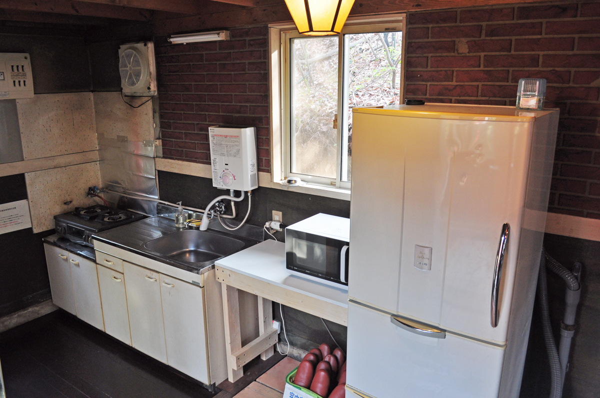 屋内 電源・トイレ・給湯・エアコン(夏期)・石油ファンヒーター(冬期)・扇風機(夏期)・テーブル・イス・キッチン・冷凍冷蔵庫・炊飯器(1升炊き)