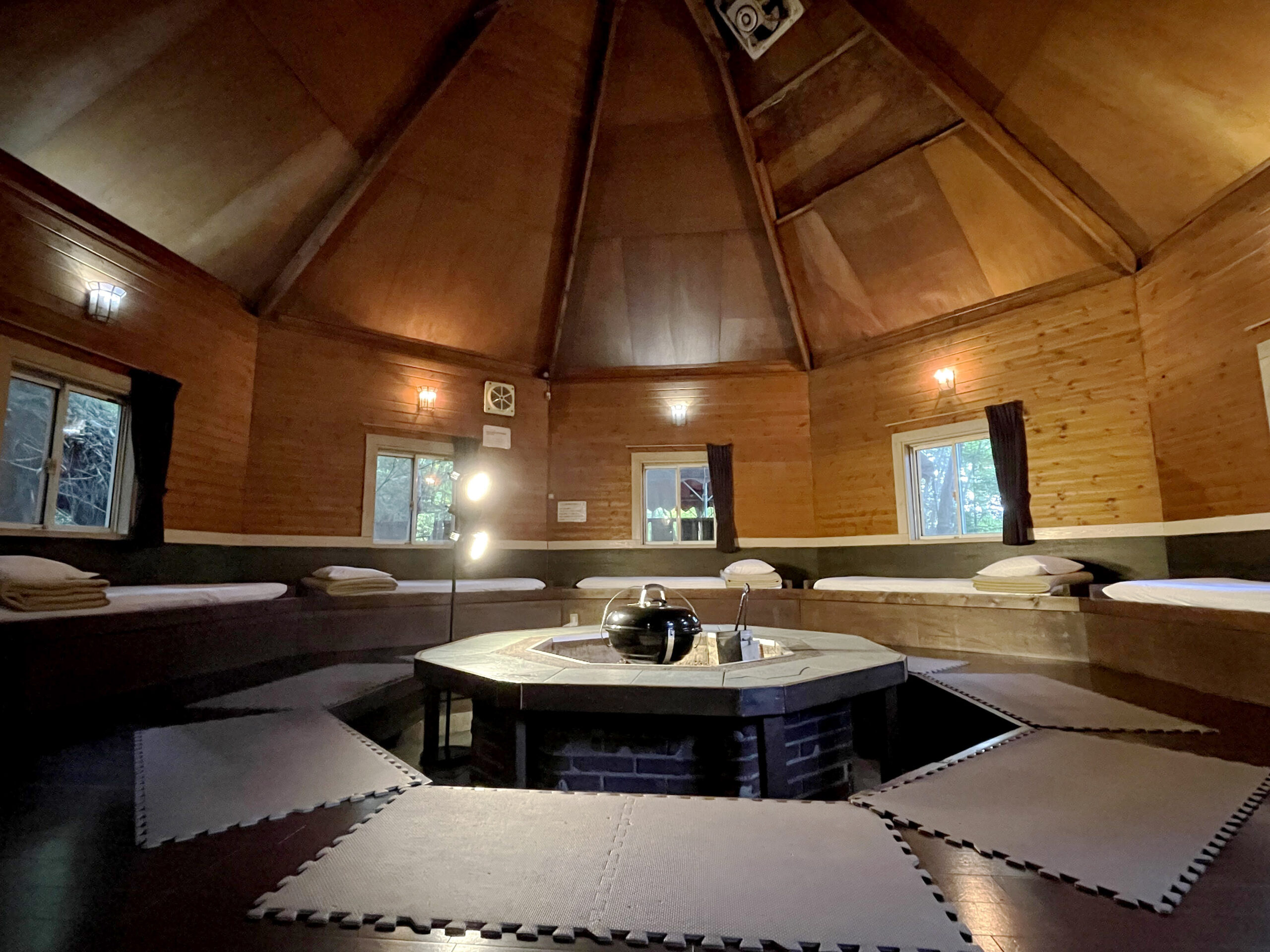 八角形の広々としたメインルームの中央で、囲炉裏風BBQが楽しめるユニークなコテージ。