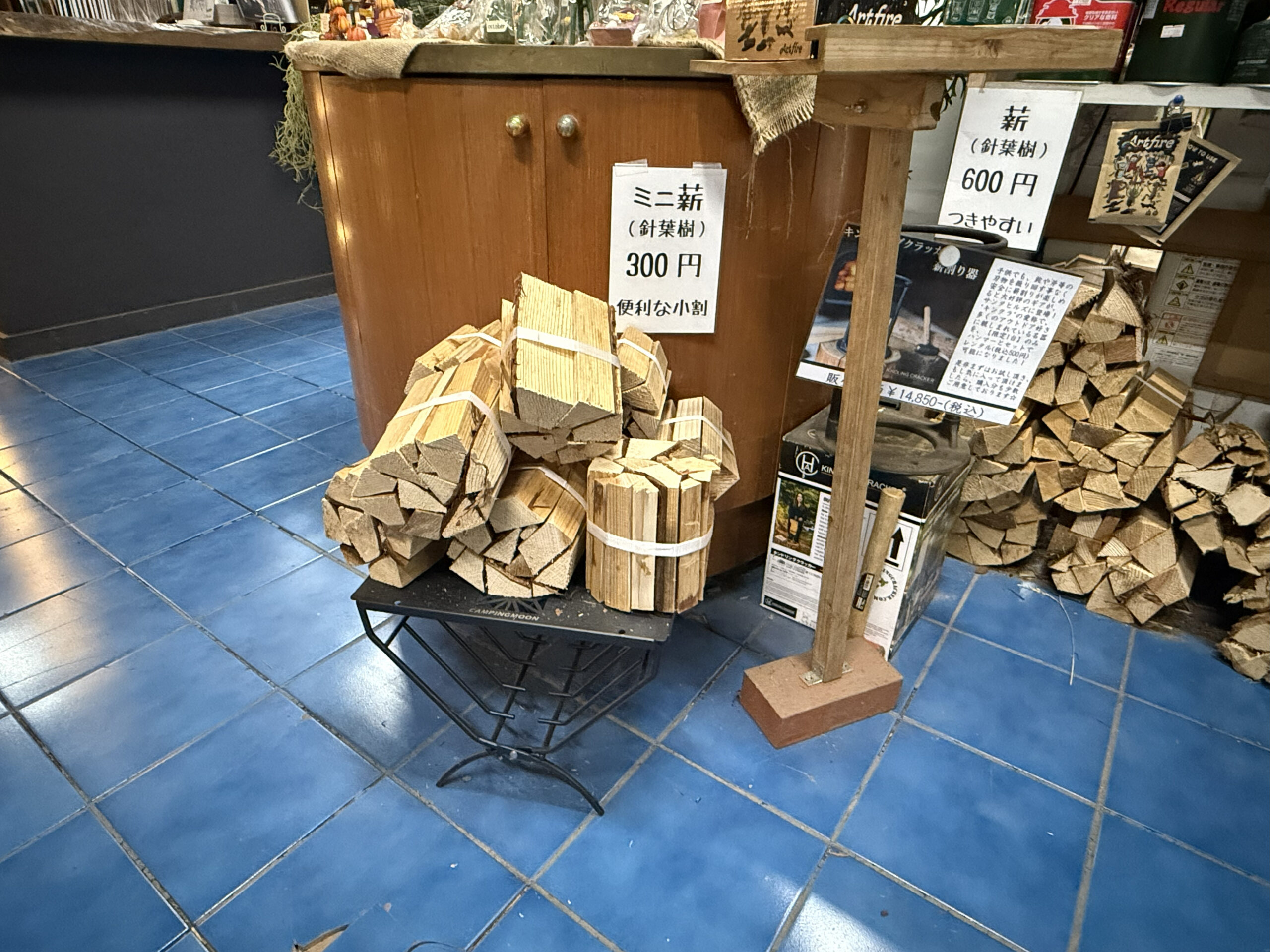 薪(針葉樹600円・広葉樹800円)・炭(3kg入)・着火剤・固形燃料・ロングライター・食器用洗剤・スポンジ・軍手・塩・醤油・香辛料・油類・氷・レトルトカレー(前田牧場)・レトルト白飯・割り箸・ペーパータオル・ラップ・ホイル・使い捨て食器・電池・キャンピングガス・パラフィンオイルなど
